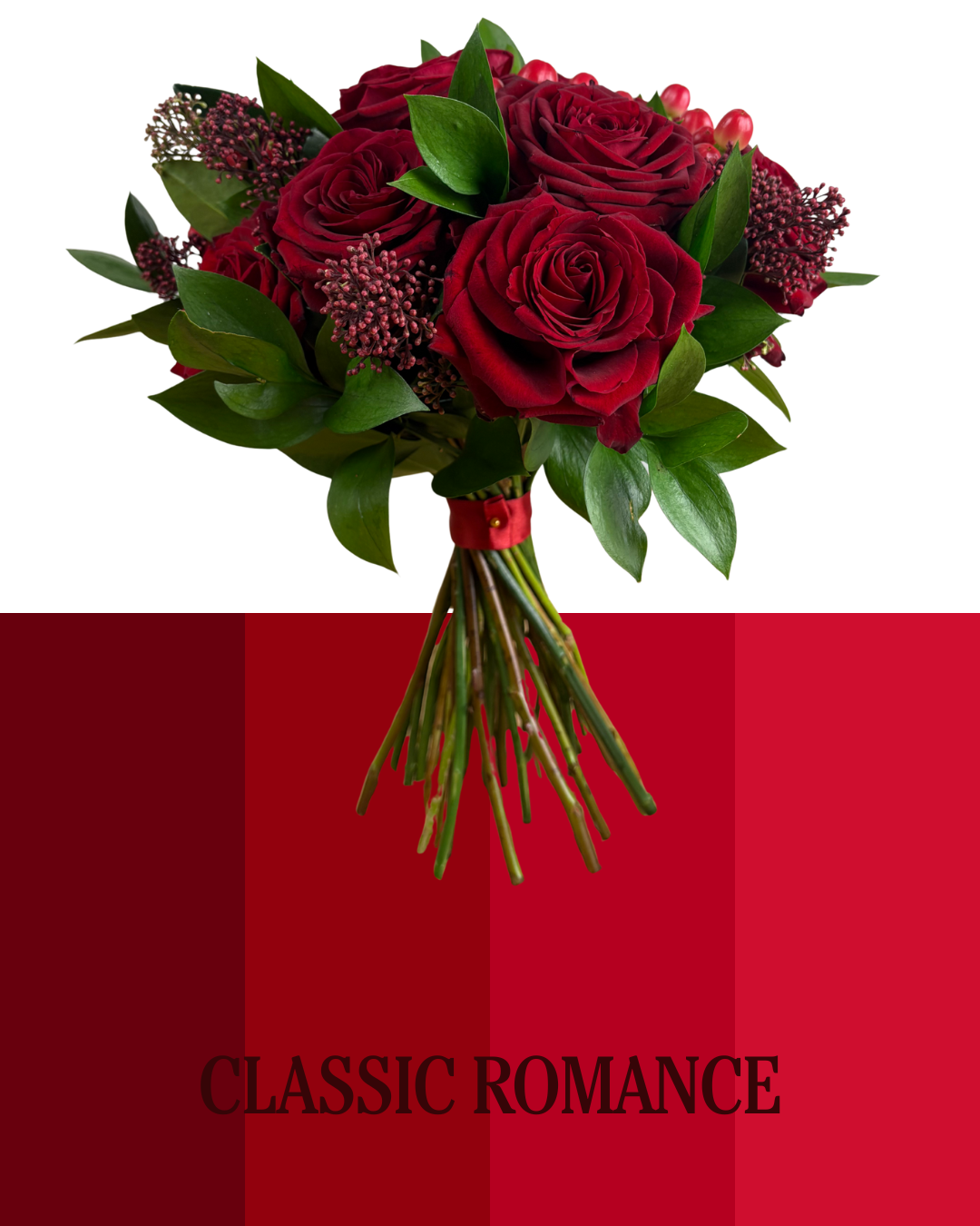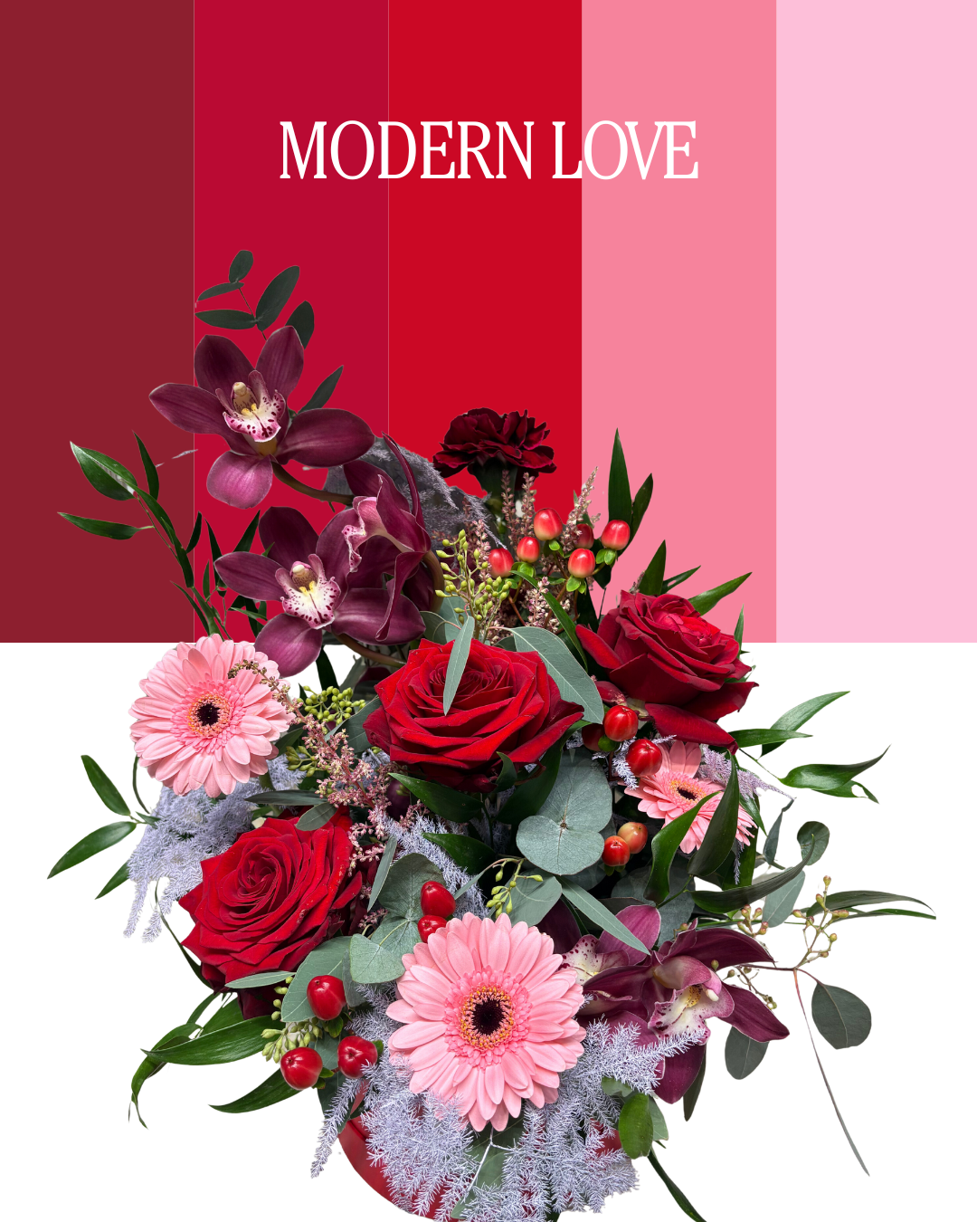 We create each one on a base of foliage, packing it with fresh seasonal stems arranged in floral foam and presented in a red or pink hatbox. The result? A no fuss, high-impact design that’s ready to display the second it arrives, no vase needed!