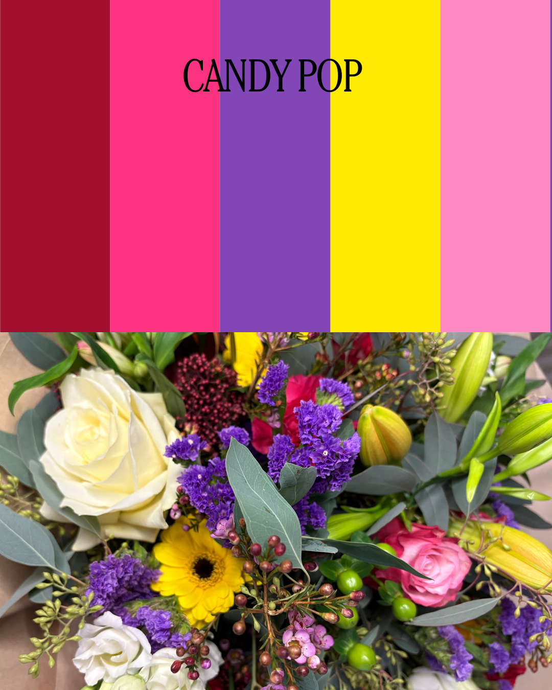 Choose you preferred colour palette and our florists pick from the best of the flower bar that week so every hatbox is unique.